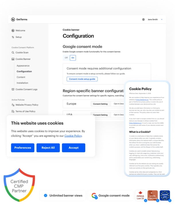 Enabling Google Consent Mode is easy with GetTerms’ Consent Management Platform (CMP)! We’ve created a Google Tag Manager template and video guide to help you quickly setup Consent Mode, and get back to business.